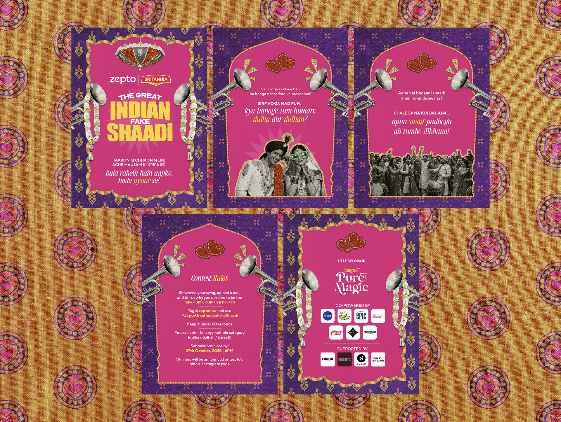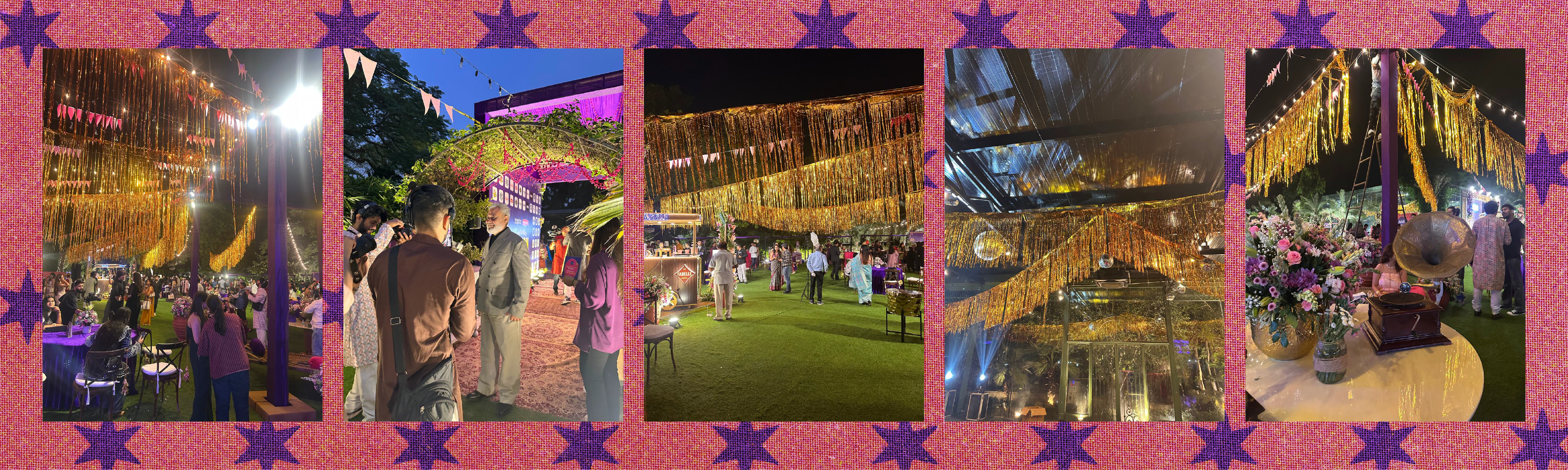 We began shaping the creative long before sponsors came on board. The direction was clear from day one- a loud, unapologetic ’90s desi middle-class wedding aesthetic. Think blaring brass bands, bright backdrops, ornate borders, heavy florals, and patterns fighting for attention.